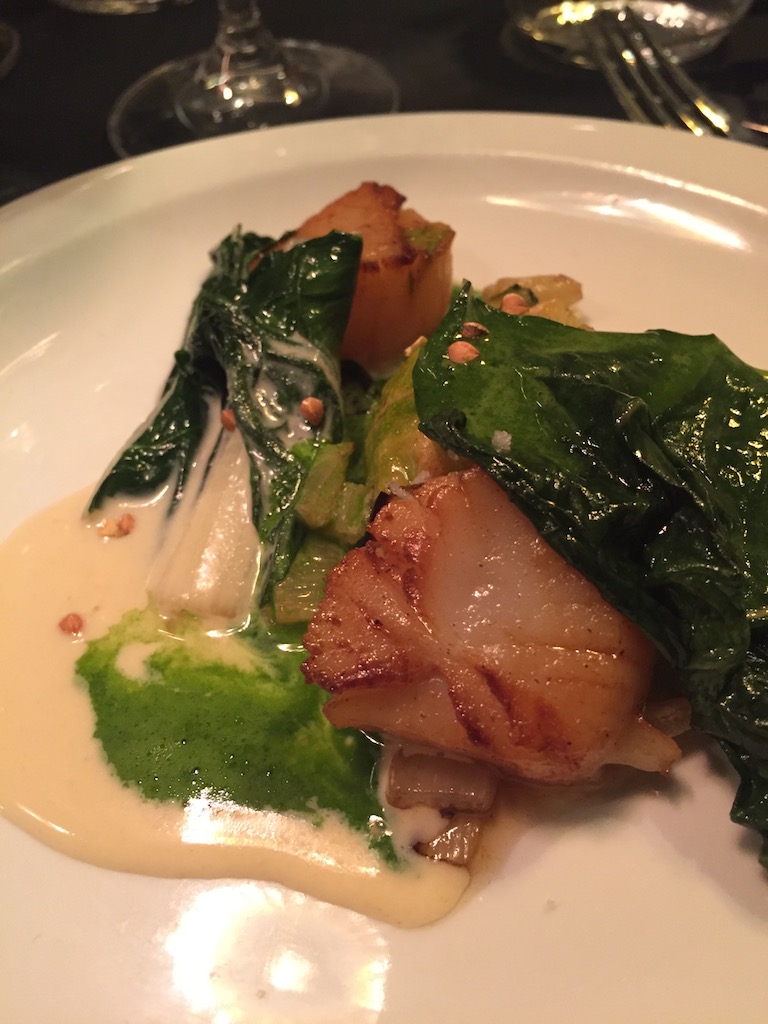En entrée, nous avons eu des Saint-Jacques de plongée, pomme bénédictine rôtie, émulsion Haddock fumé, avec un Haut-Poitou Cuvée Brizay 2014 et un Touraine Chenonceau TBK 2015. Les Saint-Jacqutes étaient parfaites et l’émulsion de haddock surprenante. Un régal! Côté vin, j’ai particulièrement aimé le Haut Poitou, plein de fraîcheur.