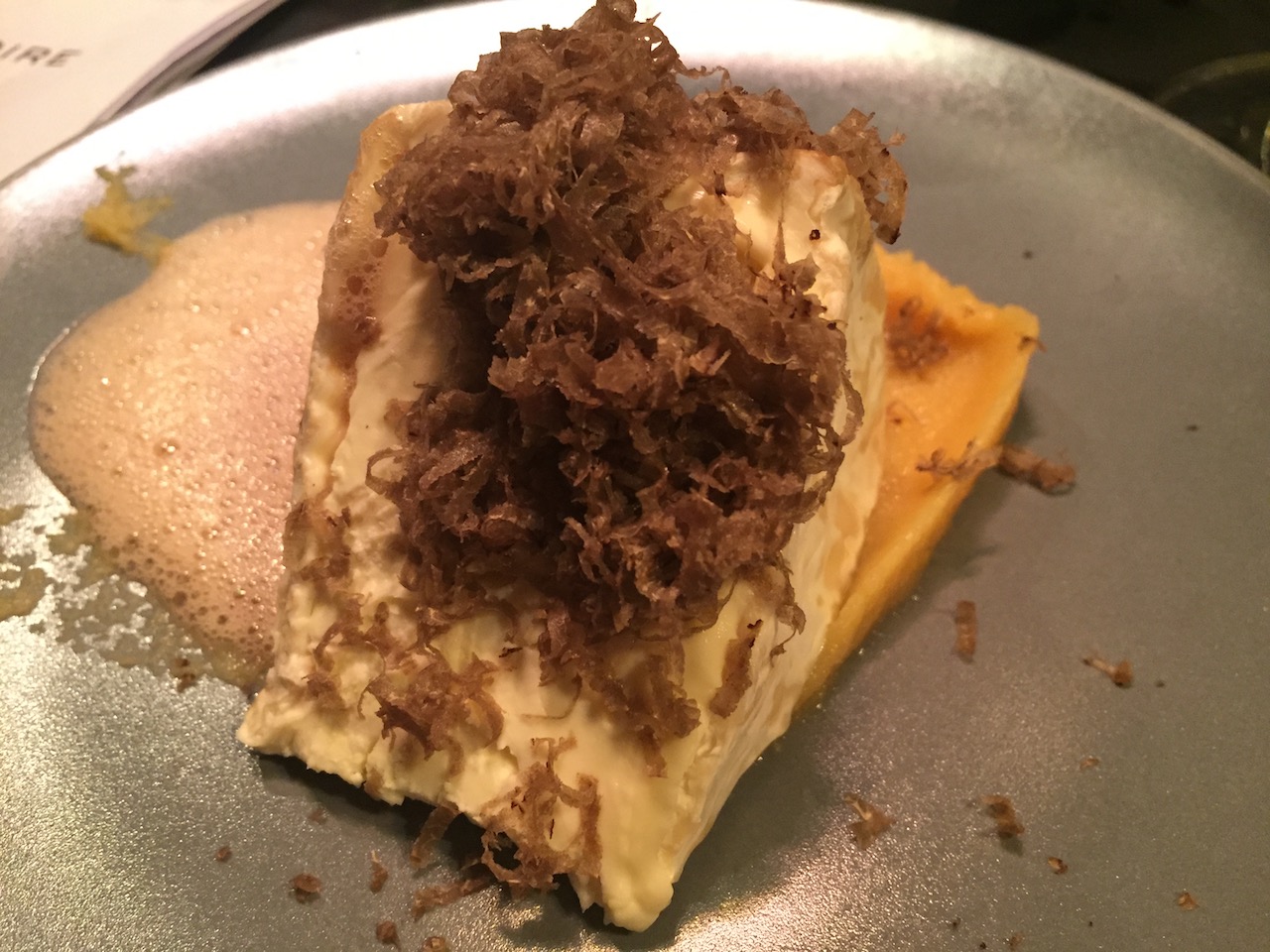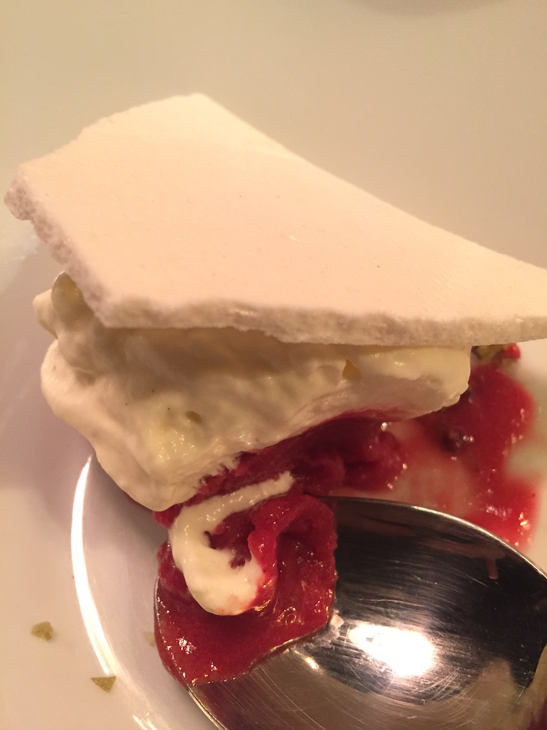 Une fois n’est pas coutume. : le dessert a été servi avant le fromage. Il s’agissait d’un dessert peu sucré et très original intitulé Betterave Chioggia et bergamotte de Calabre comme un vacherin. Excellentissime ! Un vraie bonne surprise. Qui aurait cru qu’un sorbet à la betterave pouvait être aussi bon… Encore une fois, on a pu dégusté deux vins en accord avec ce plat : un Pouilly Fumé de Chai 2015 et un Touraine Sauvignon Château de Pont 2015.