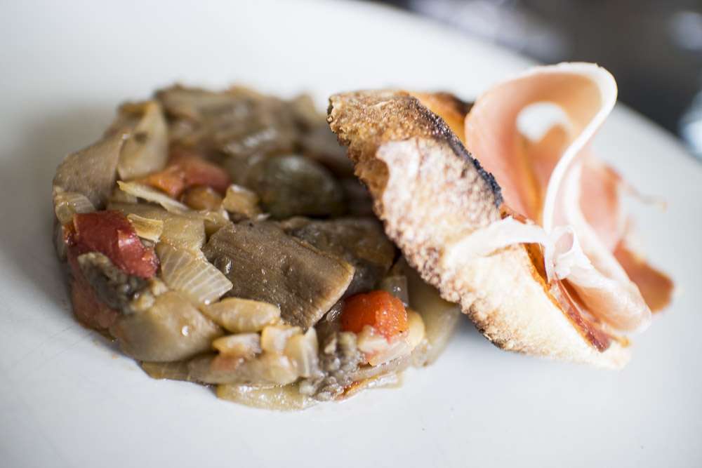 Ce plat peut servir d’accompagnement à une viande. Il se mange également en entrée comme ici : servi avec un crostino et un peu de jambon serrano. Le fondant des légumes se marie très bien avec le croquant du pain.