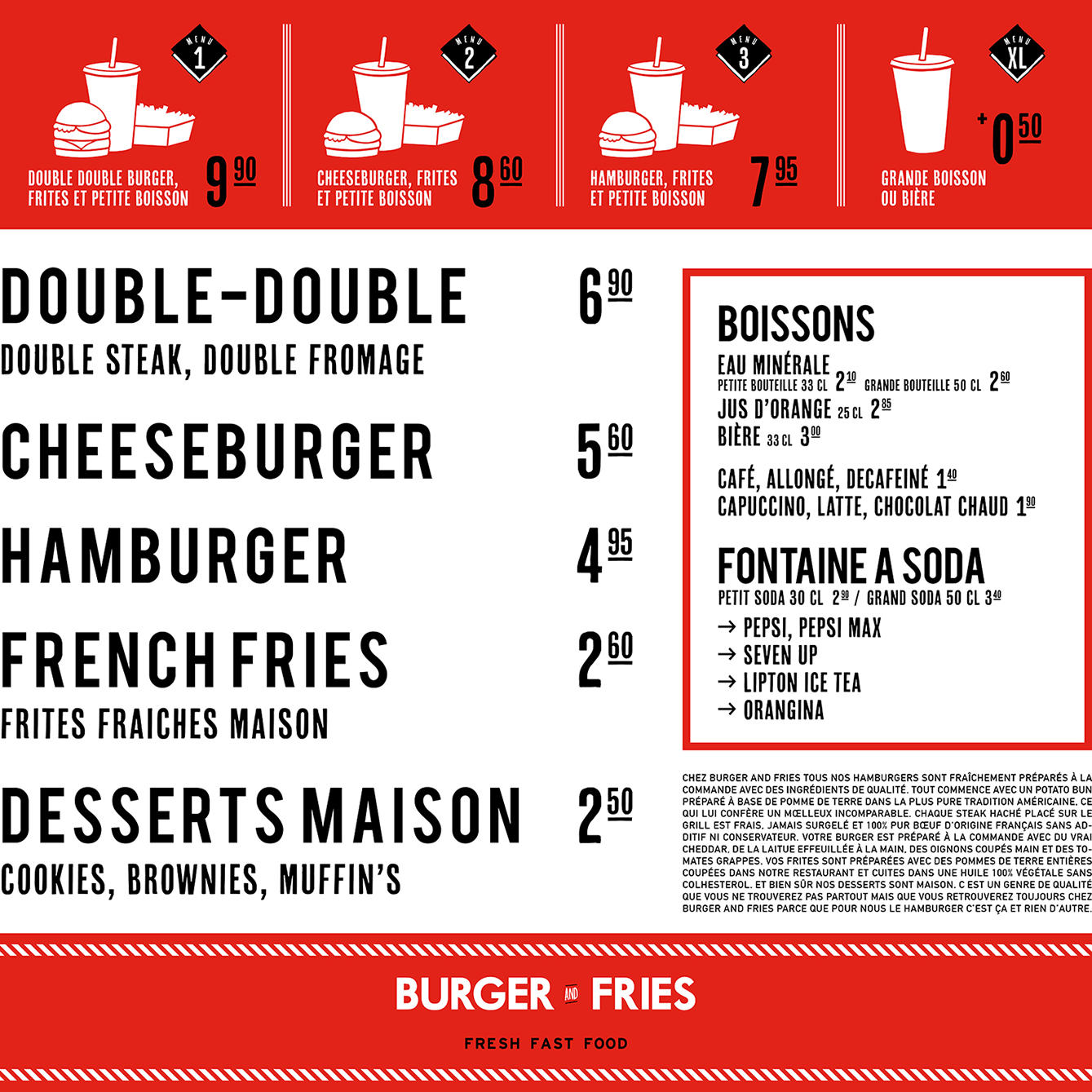 Trois sortes de burger sont proposés : hamburger, cheeseburger et double-double. On vous propose également l’option bacon et le choix entre oignons grillés ou oignon crus. Je vous recommande également la sauce maison.