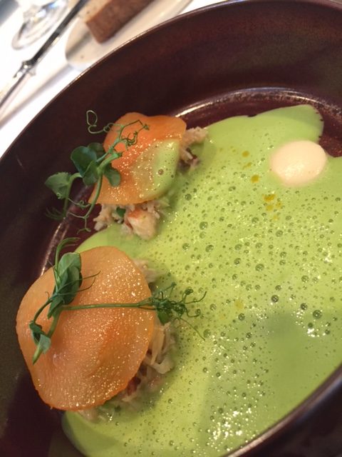 Plat #2 : Le tourteau de Bretagne et son velouté de petits pois : délicat et frais.