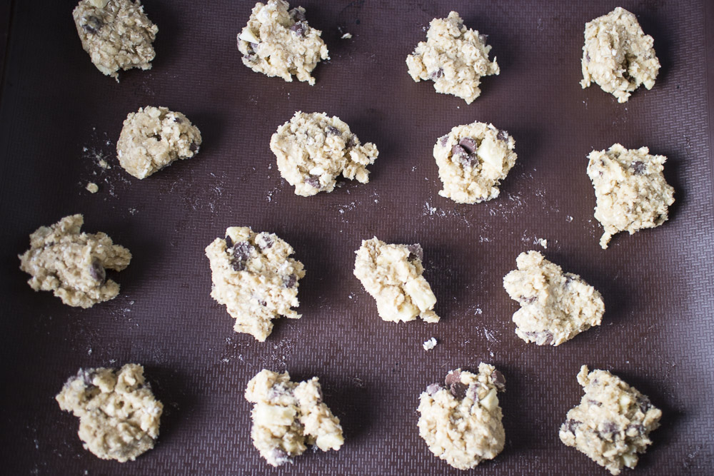 Alors, voici une recette de cookies aux flocons d’avoine à laquelle j’ai ajouté des pépites de chocolat au lait et du chocolat blanc coupé en morceaux. Je les avais sous la main mais évidemment, vous pouvez les remplacer par du chocolat noir ou, pour rester dans la thématique healthy, des raisons secs ou des cranberries.