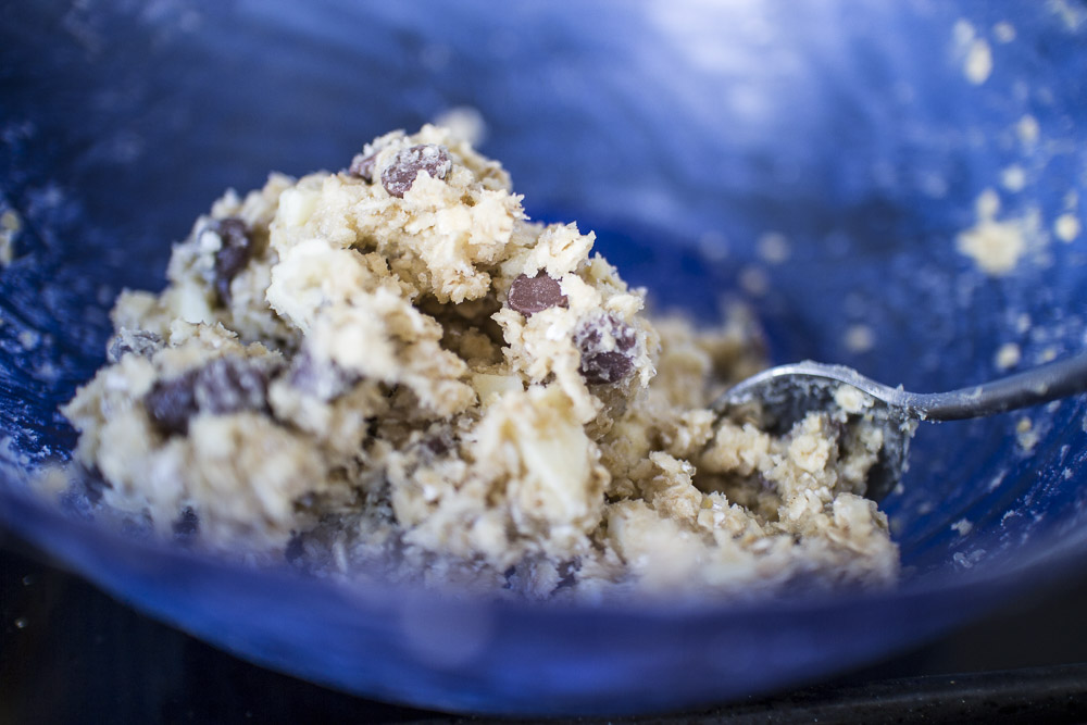 Préchauffer le four à 180 degrés. Pendant ce temps, faire des boules assez grosses, qu’on aplatit un peu : comme une balle de golf. Plus petit, on ne découvrira pas toutes les textures : croustillant à l’extérieur et moelleux au milieu. The best !