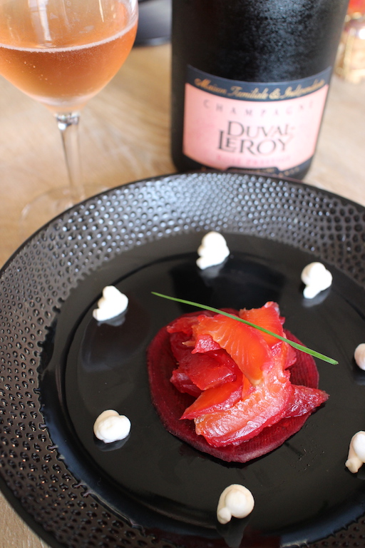 Et voilà le travail. Ca nous donne une entrée assez chic pour pas trop de travail finalement. Si ce n’est de la patience. Pour être encore plus chic, on accorde ce joli plat avec un chammpagne rosé de la maison Duval-Leroy.