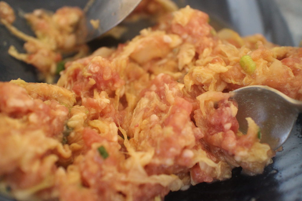 Préparer la farce en mélangeant le porc, le chou chinois et les oignons verts émincés et enfin l’oeuf légèrement battu au préalable.